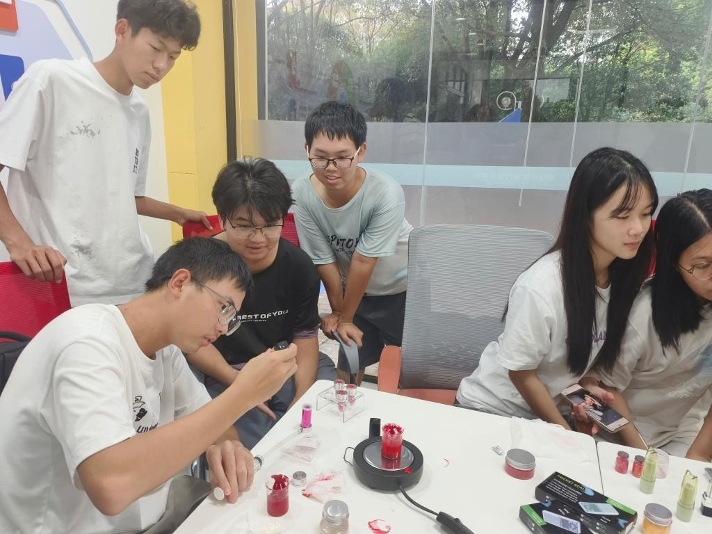 活动现场,化学协会成员介绍了口红制作的步骤与注意事项,并阐释了其中蕴含的化学原理,如不同成分在加热、融合过程中的化学反应以及对口红色泽、质地的影响。为了让同学们有更直观的认识,成员还进行了现场演示,从色粉的调配、精油与蜂蜡的融合,到灌装操作的手法,每一个步骤都逐步讲解。随后,同学们纷纷动手,自行挑选色粉调配颜色,制作属于自己的冬日口红。