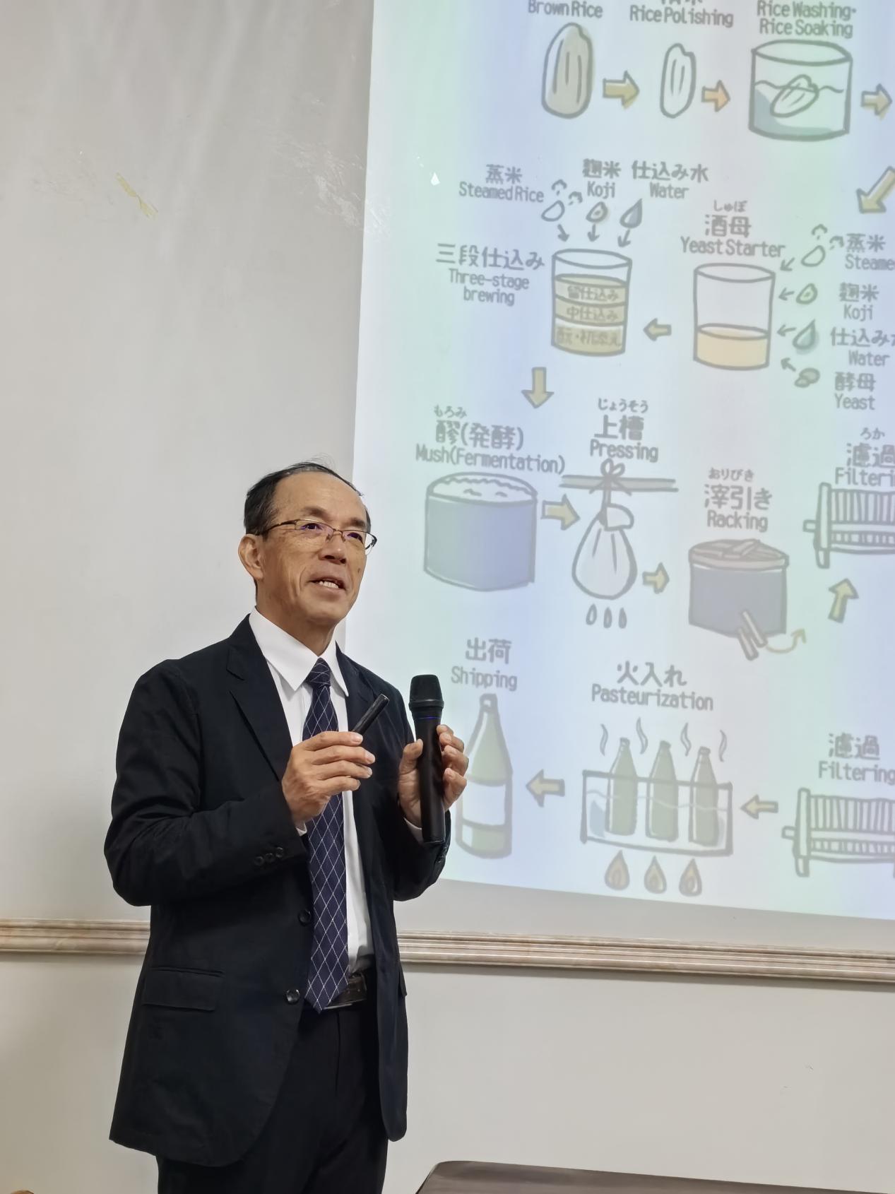 尾形武文研究员的报告从日本清酒的种类与工艺、酒米原料的特征、水稻品种的改良技术等方面展开。他指出制酒大米需具备颗粒饱满、蛋白质和脂肪含量低的特征,以减少杂味,代表品种 “山田锦” 的中心 “心白” 部分富含淀粉,是酿酒的优质原料。水稻品种改良借助杂交育种与分子标记技术,定向提升精米率和风味前体物质含量,增强酿酒适配性。面对全球变暖挑战,他分享应对方案:团队通过杂交育成 “梦一献” 耐高温酒米,产量达 66.0kg / 亩,远超山田锦;同时优化栽培技术,以流水灌溉降温、精准施肥控产,减少高温对酒米品质的影响。最后他从酒的加工工艺特点、贮藏期、饮用方式等方面分析了中日酒文化差异。